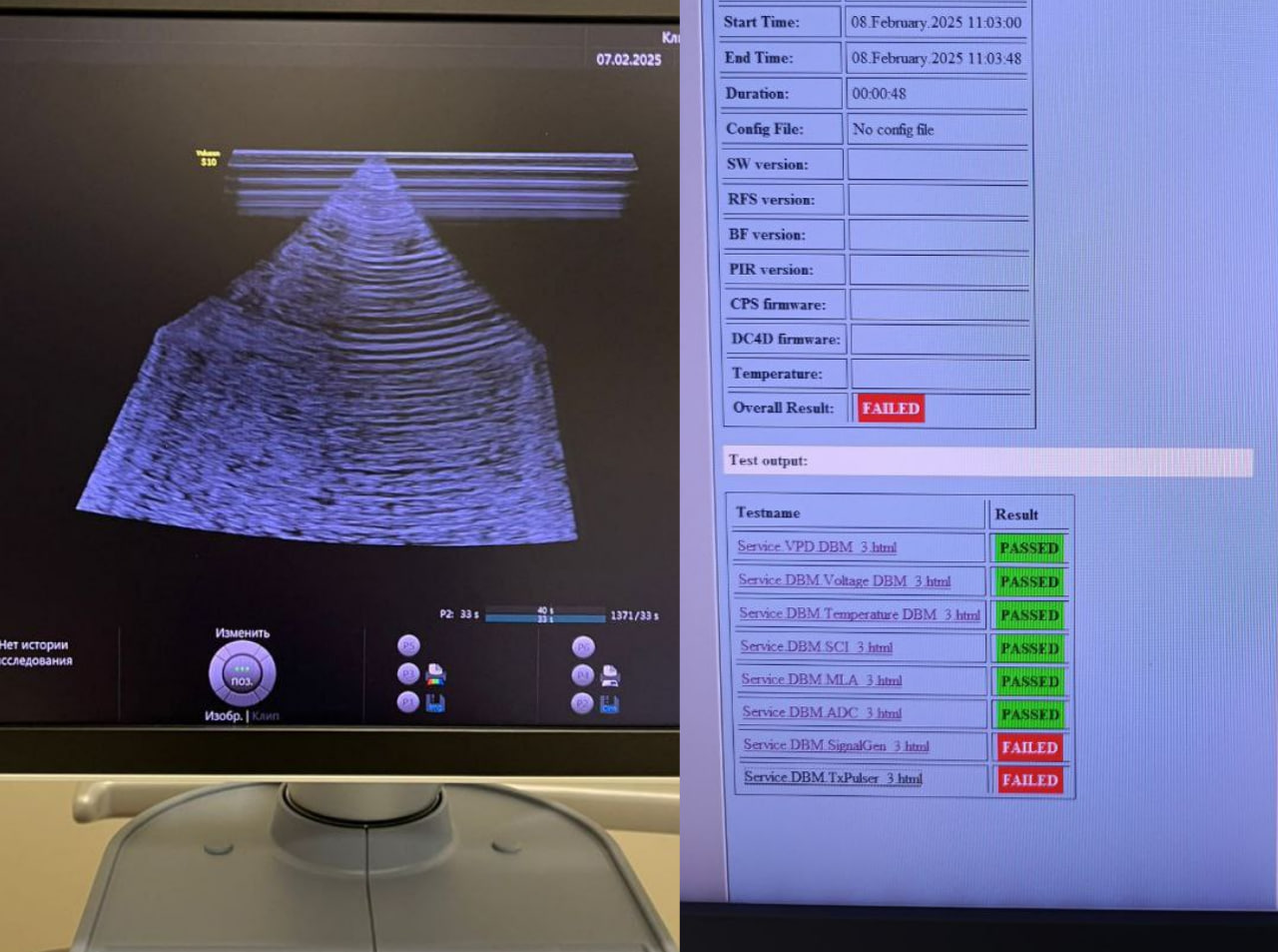 Проделанная работа: Проведены сервисные тесты, в ходе которых выявлена неисправность платы формирователя луча DBM128 (PN: KTZ5773602, 5573638). Выполнен компонентный ремонт: заменены вышедшие из строя элементы. После ремонта проведено повторное тестирование, результат положительный. Проверка работоспособности с различными датчиками показала стабильную работу — изображение без помех и артефактов.