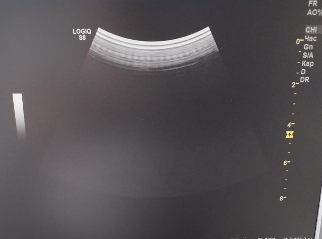 ⚠️ Неисправность: Во время сканирования на изображении наблюдались помехи — вертикальные полосы, нарушающие визуализацию по всей глубине. Артефакты проявлялись на всех датчиках и во всех режимах.